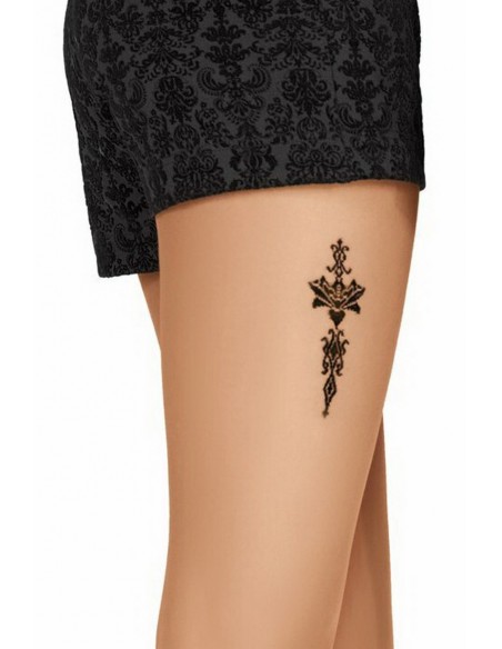 Model tip tatuaj tesut cu fir negru pe fundalul beige al ciorapului.