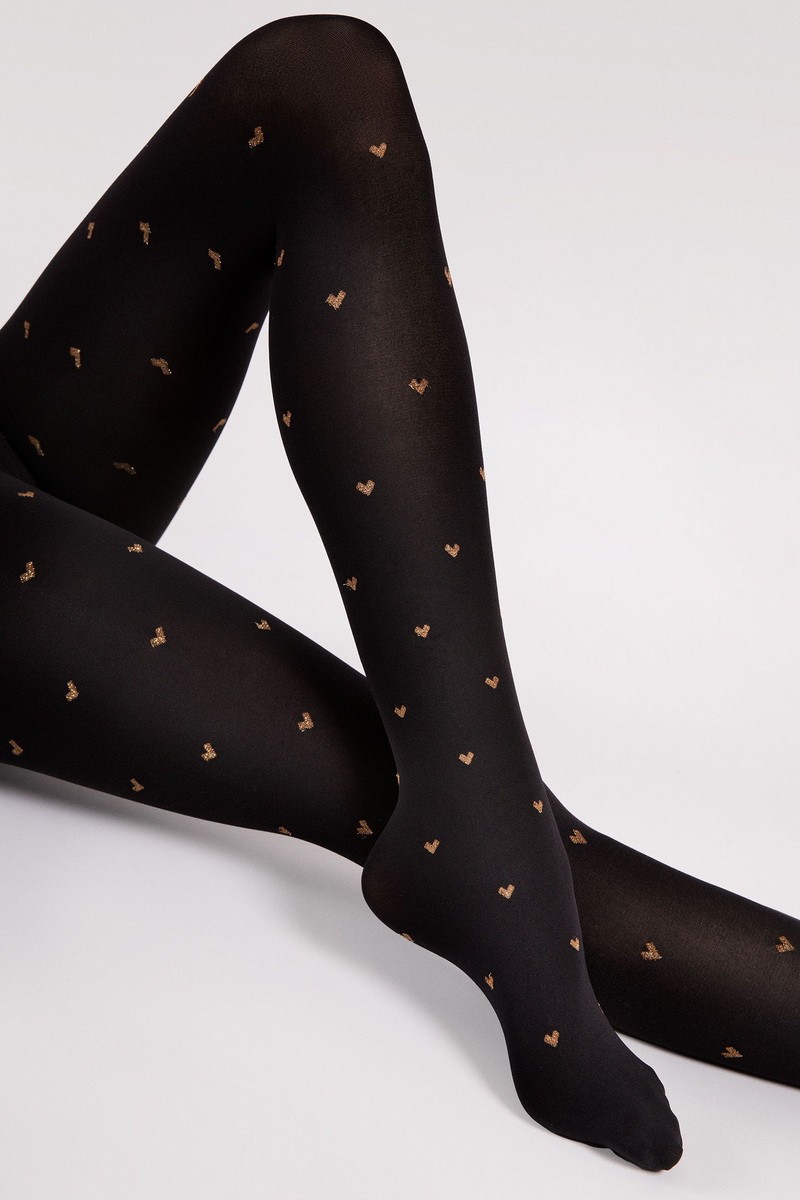 Ciorapi 60 den negrii din microfibra , model cu inimioare de culoare cuprului , opaci , usor de asortat tinutelor de toamna/iarna.